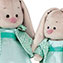 Летнее, романтичное пальтишко плотного, мятного цвета из жаккардового хлопка со сложным, контрастным орнаментом. На воротничке с закруглёнными краями - украшение в виде нежного, бирюзового цветка из лент. В комплекте – лёгкое платье из шёлкового крепа, расклешённое к низу прохладного, ментолового цвета. Платье украшает мягкий, широкий пояс из бирюзового шёлка.